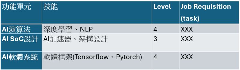 > 某半導體A公司,打算開發HPC AI晶片這項產品,而此AI晶片會使用到的功能單元(技術模組)有:AI演算法、AI SoC設計、AI軟體系統